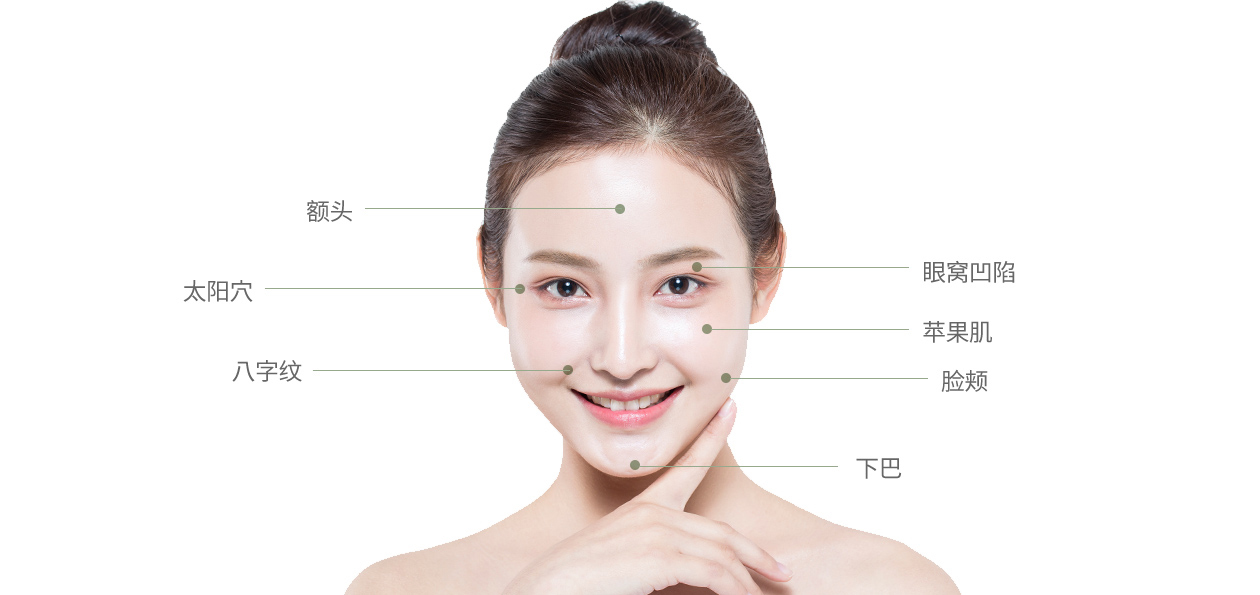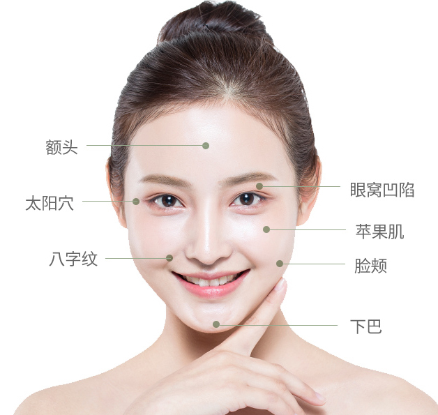 太陽穴, 蘋果肌, 八字紋, 臉頰, 下巴, 眼周等凹陷部位進行填充的手術方法。